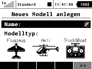 Wenn man den Menüpunkt "neues Modell anlegen" ausgewählt hat, erscheint folgender Bildschirm. Übrigens sollte man nicht vorhandene Modelle kopieren um ein völlig neues Modell anzulegen. Der Dateiname des bisherigen Modells wird nämlich beibehalten und nur indiziert. Der Name lässt sich auch nicht manuell ändern. Also lieber ein "frisches" Modell unter der aktuellen Firmware anlegen.