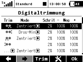 Es sind nun auch unterschiedliche Trimm-Modi anwählbar. Standard war bisher der Modus "Zentriert", bei dem die Mittelstellung unter Beibehaltung der Maximalwerte, verändert wurde. Nun sind auch die Modi "Linear" (auch Endstellung wird verschoben), Dros-Min (Trimmung des Minimums), z. B. für Standgastrimmung, Dros-50% (Trimmung nur unterhalbder Mitte) und Dros-Voll (Trimmung nur am Maximum).
